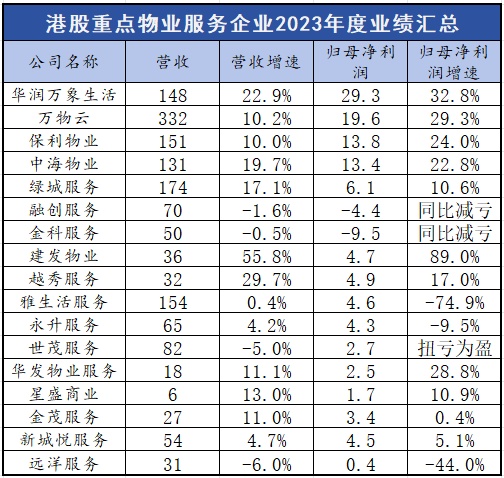 行业步入低速增长时代,上市物企的业绩出现两极分化现象也就在情理之中了。2023年,关联房企风险可控的央国企物业企业普遍取得了稳中有进的业绩表现。比如,保利物业的收入增加了10%至151亿元,归母净利润增加了24%至13.8亿元,核心财务数据呈稳健增长态势。其余又如中海物业等物企亦实现了营收和归母净利润的双位数增长。