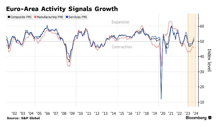 Bloomberg Economics经济学家David Powell表示:“欧元区综合PMI数据表明,在高通胀持续的情况下,欧元区经济的复苏势头正在增强,这应该会强化欧洲央行鹰派的观点,他们希望在6月首次降息后,在7月暂停降息。”
