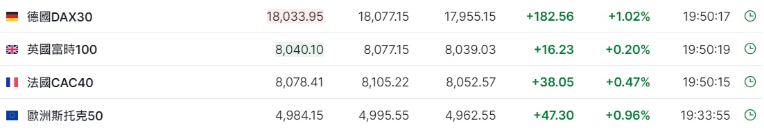 2. 截至发稿,德国DAX指数涨1.02%,英国富时100指数涨0.20%,法国CAC40指数涨0.47%,欧洲斯托克50指数涨0.96%。
