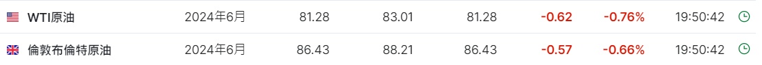 3. 截至发稿,WTI原油跌0.76%,报81.28美元/桶。布伦特原油跌0.66%,报86.423美元/桶。