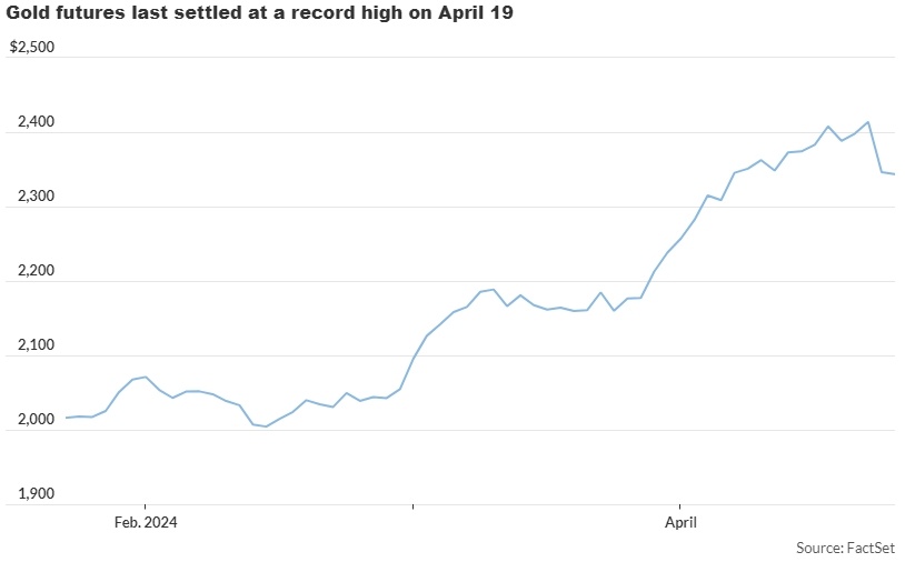 截至本周二,6月交割的黄金期货在纽约商品交易所下跌了4.3美元,跌幅为0.2%,收于每盎司2,342.1美元,这是自4月4日以来的最低收盘价。