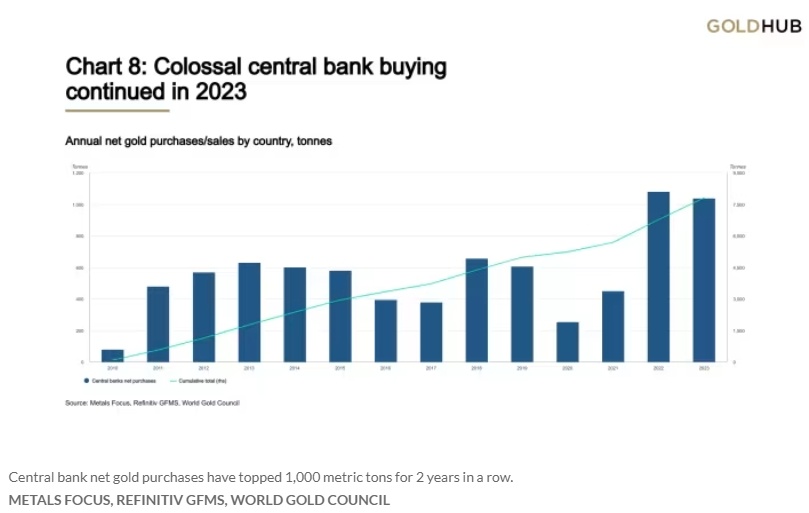 根据世界黄金协会的数据,2023年央行的黄金需求总量为1,037.4公吨,略低于2022年创下的1,081.9公吨的历史最高记录。