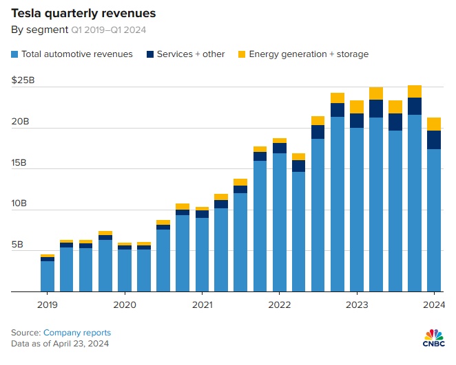 财报显示,特斯拉第一季度营收为213.01亿美元,不及分析师预期的221.5亿美元,较上年同期的233.29亿美元下降9%,创2021年以来的最大同比降幅。按业务划分,汽车业务营收为173.78亿美元,同比下降13%;能源发电和存储营收为16.35亿美元,同比增长7%;服务和其他业务营收为22.88亿美元,同比增长25%。
