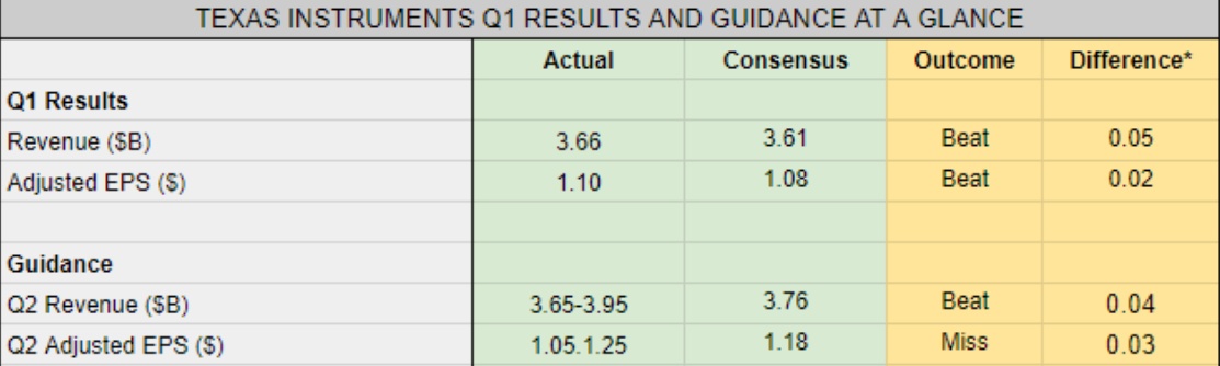 智通财经获悉,模拟半导体公司德州仪器(TXN.US)公布了第一季度财务业绩。财报显示,Q1营收为36.6亿美元,同比下降16.4%,为2020年以来的最低水平,市场预期为36.1亿美元。非GAAP每股收益为1.1美元,预期为1.08美元。净利润为11.1亿美元,同比下降35%,预期为9.83亿美元。