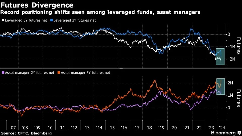 与此同时,高于预期的通胀数据也在扰乱期货仓位。美国商品期货交易委员会(CFTC)的数据显示,资产管理公司已转向创纪录的2年期和5年期美国国债期货净多头。据美国银行的一份分析报告,这种变化可能反映出,随着收益率飙升,投资者纷纷退出空头头寸。