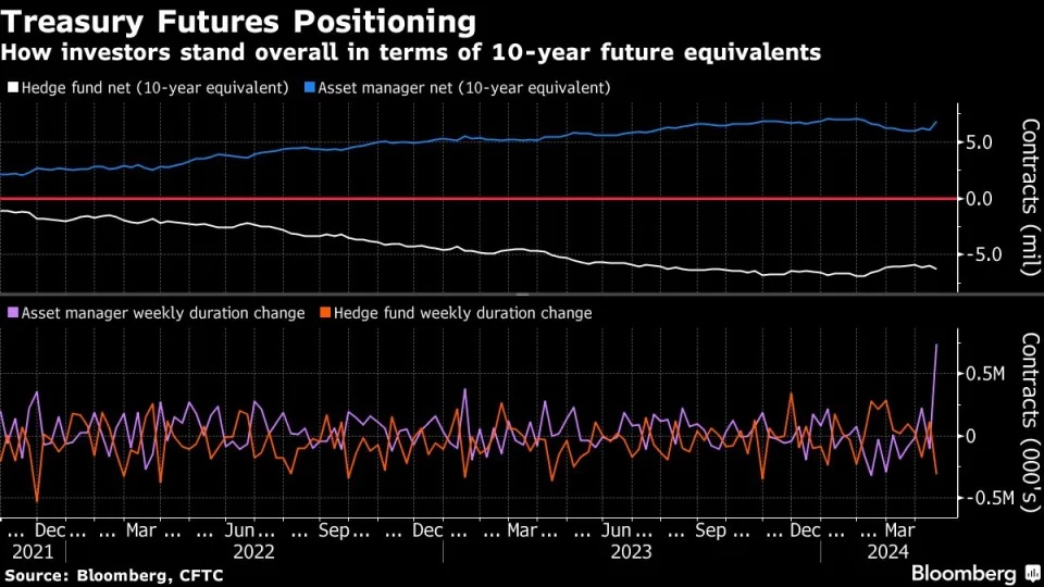 尽管资产管理公司在2年期和5年期美国国债期货的净多头仓位升至纪录高位,但对冲基金似乎确实持有另一方的部分仓位。CFTC截至4月16日的数据显示,这些投资者净增持了30.7万份10年期美国国债期货。多数投资也出现在2年期和5年期国债上,杠杆基金目前在这两个领域的空头头寸达到创纪录水平。