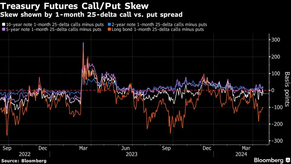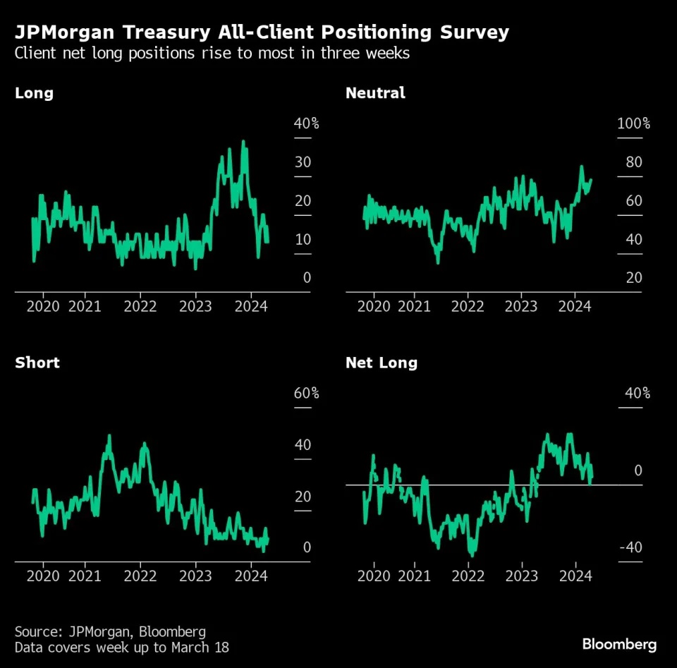 尽管如此,一些交易员仍在为美国国债可能进一步下跌做准备,此前抛售将各种期限债券的收益率推高至2024年高点。周二美国国债期权中最引人注目的是一笔1100万美元的押注,目标是10年期美国国债收益率在一个月内升至5%以上,而目前的收益率约为4.6%。在现货市场,摩根大通最新的客户调查显示,中性仓位为两个月来最大。