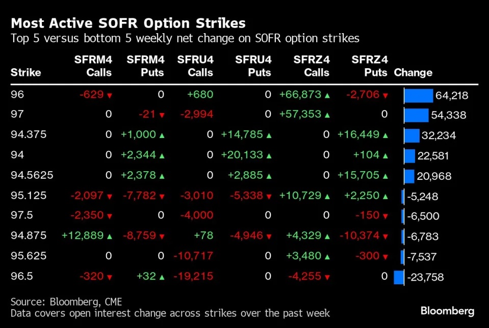 过去一周风险增加最多的期权包括执行价94.375的合约,这是鹰派仓位的押注。相关期权的目标押注目前是年底收益率约为5.625%至5.875%,高于目前5.33%的美联储有效利率。不过,并非都是单向押注,执行价96.00和97.00看涨期权的风上周增加最多,该价差的目标是美联储在年底前大举降息。