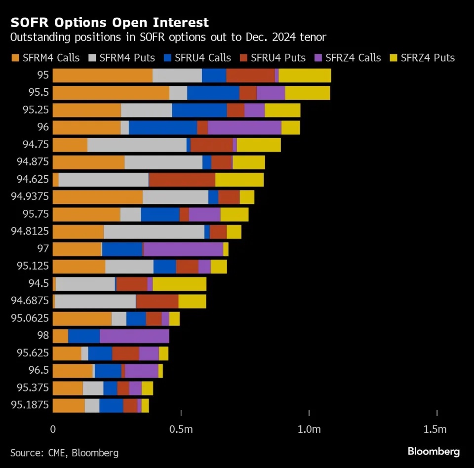 最拥挤的SOFR期权达到为12月24日会议相关、执行价95.00的合约,相当于押注5%的利率,6月24日会议相关的看涨期权中仍有大量未平仓合约。在6月24日会议相关、95.50执行价的合约中也出现了大量未平仓合约,这是规模第二大的合约。在其他期权中,6月24日会议相关在94.75、94.875和94.9375行权区间仍有相当数量的未平仓看跌期权。