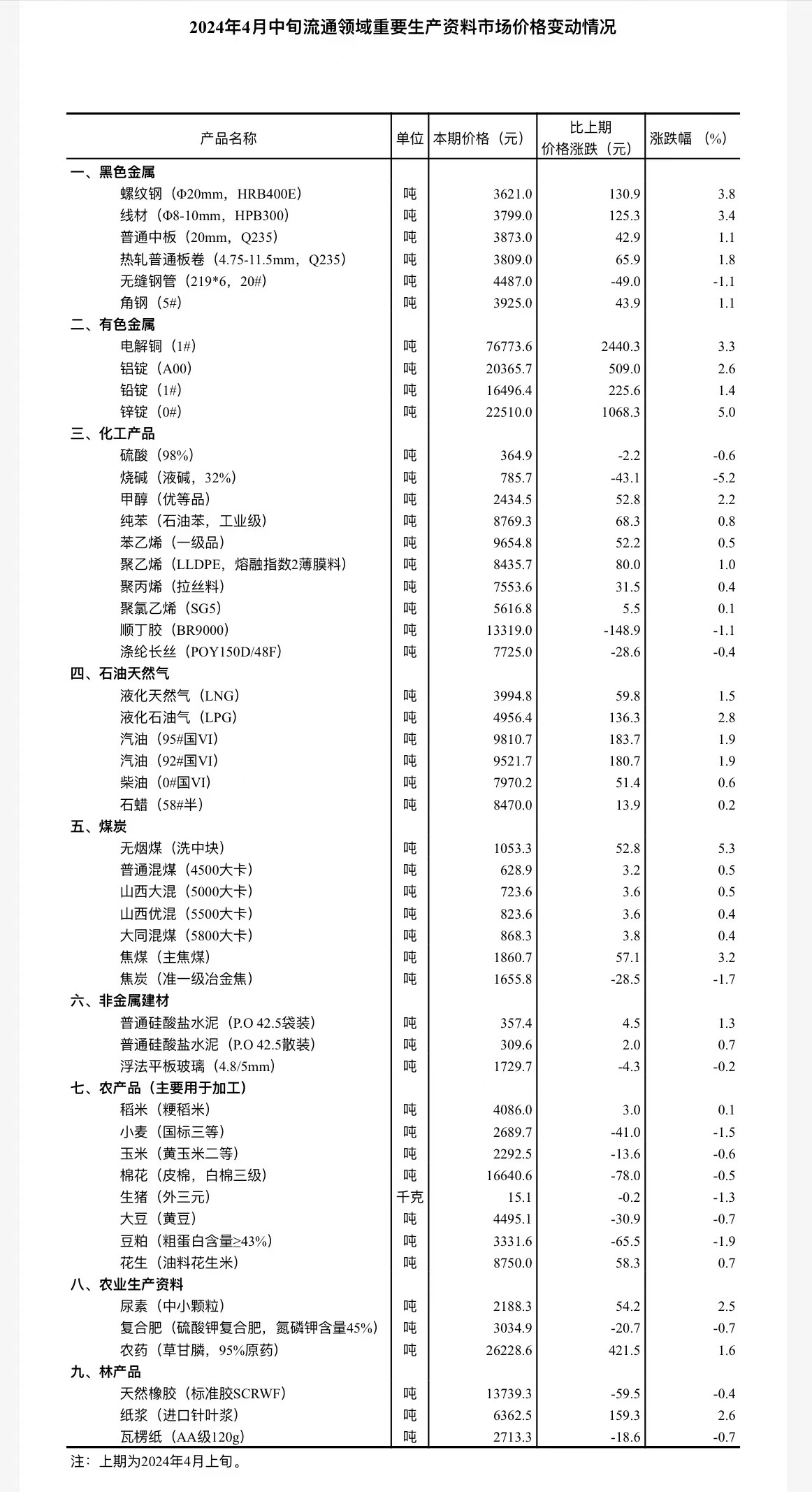 智通财经APP获悉,4月24日,国家统计局发布4月中旬流通领域重要生产资料市场价格变动情况。据对全国流通领域9大类50种重要生产资料市场价格的监测显示,2024年4月中旬与4月上旬相比,34种产品价格上涨,16种下降。其中,生猪价格为15.1元/千克,较上旬环比下降1.3%。