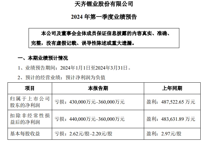 昨日晚间,深交所对天齐锂业下发关注函,要求结合主营业务开展情况、产品产销量、产品价格、原材料采购价格、成本费用、减值计提等因素的具体变化情况,量化分析2024年一季度亏损较2023年四季度大幅增加的原因,并说明是否存在持续亏损风险等。