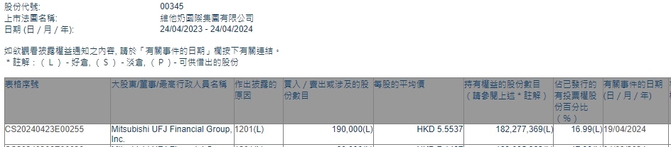 智通财经APP获悉,香港联交所最新资料显示,4月19日,Mitsubishi UFJ Financial Group, Inc.减持维他奶(00345)19万股,每股作价5.5537港元,总金额约为105.52万港元。减持后最新持股数目约为1.82亿股,最新持股比例为16.99%。