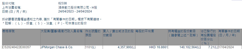 智通财经APP获悉,香港联交所最新资料显示,4月17日,摩根大通增持潍柴动力(02338)435.79万股,每股作价16.8661港元,总金额约7350.08万港元。增持后最新持股数目约1.4亿股,最新持股比例为7.21%。