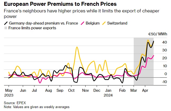 据法国电网运营商RTE称,自3月初以来,向比利时、德国、瑞士和意大利输送电力的能力已经减少。这使得这些国家无法进口更便宜的法国核电,并推高了整个地区的批发价格。根据RTE的说法,这些限制应该在5月初得到解决,但从8月中旬开始可能会有更多的限制。