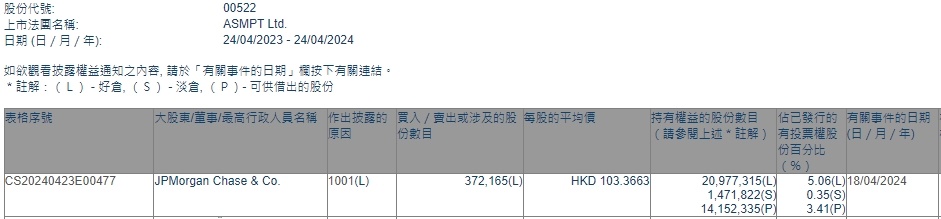 智通财经APP获悉,香港联交所最新资料显示,4月18日,小摩增持ASMPT(00522)37.2165万股,每股作价103.3663港元,总金额约为3846.93万港元。增持后最新持股数目约为2097.73万股,最新持股比例为5.06%。