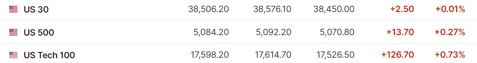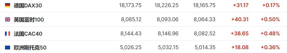 2. 截至发稿,德国DAX指数涨0.17%,英国富时100指数涨0.50%,法国CAC40指数涨0.48%,欧洲斯托克50指数涨0.36%。