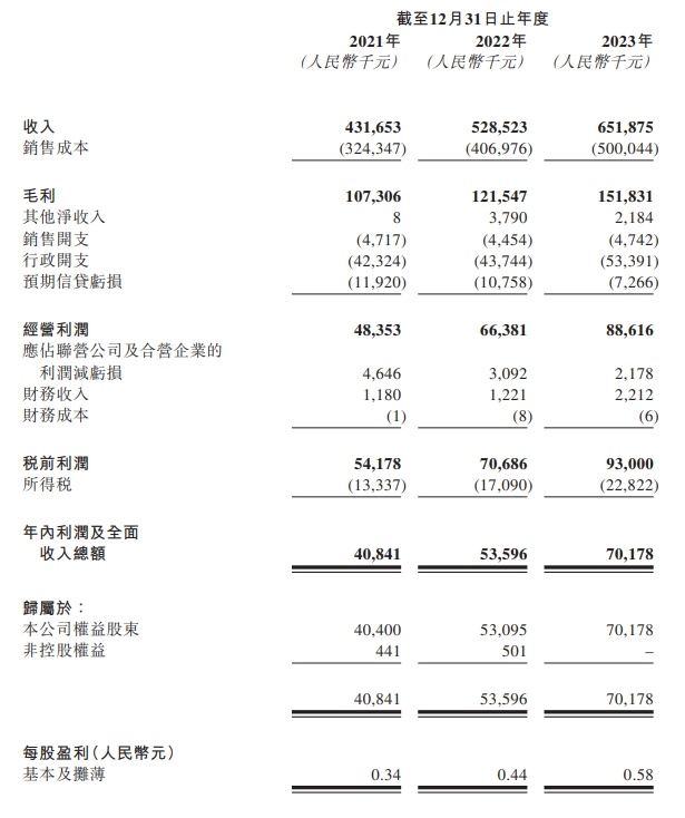 财务方面,于2021年至2023年,公司的收入按22.9%的年复合增长率由2021年的人民币4.32亿元增至2022年的人民币5.29亿元,并进一步增至2023年的人民币6.52亿元。于2021年、2022年及2023年,公司的年内利润及全面收益总额分别为人民币4084.1万元、人民币5359.6万元及人民币7017.8万元,2021年至2023年的年复合增长率为31.1%。