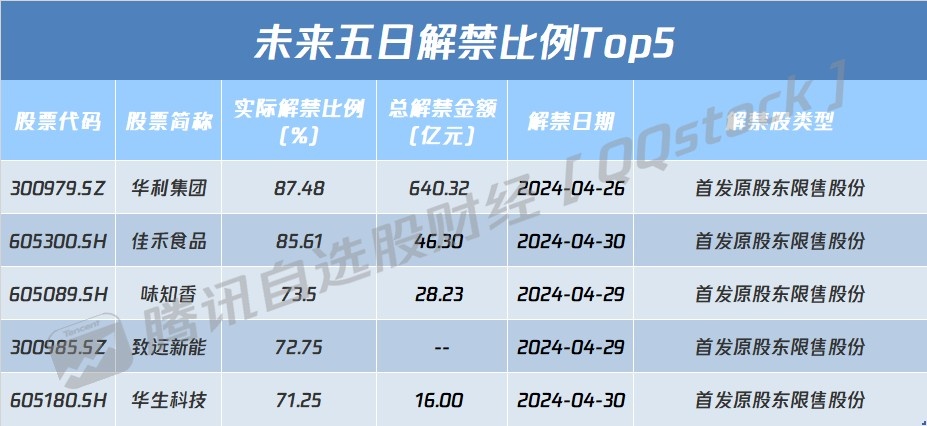 从解禁比例来看,未来五日华利集团实际解禁比例达87.48%,其次解禁比例居前的分别为佳禾食品和味知香。