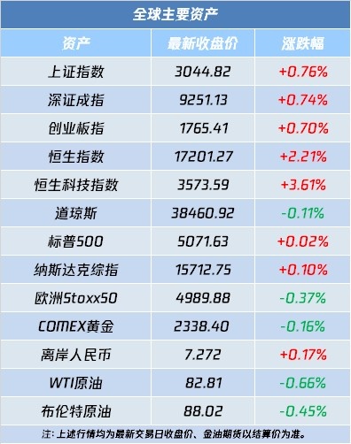 自选哥提示,隔夜美股三大股指收盘涨跌不一,道指小幅收跌,纳指、标普连涨三日;COMEX 6月黄金期货收跌0.16%,报2338.4美元/盎司;WTI 6月原油期货收跌0.55美元,跌幅0.66%,报82.81美元/桶。