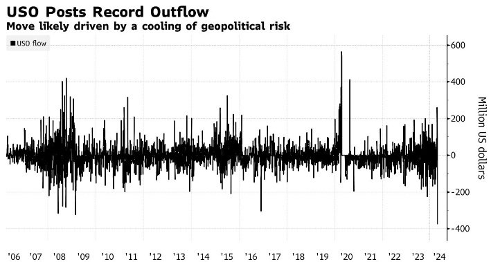 智通财经获悉,全球最大的石油ETF——美国石油基金(US Oil Fund)出现了有记录以来最大的单日资金流出,原因是原油价格失去了伊朗和以色列紧张局势带来的部分地缘政治溢价。3.76亿美元的撤资额超过了2009年创下的3.23亿美元的纪录。此前两个交易日也出现了类似的大规模资金流入。回调后,美国石油基金拥有13亿美元的资产,仍是最大的石油ETF。