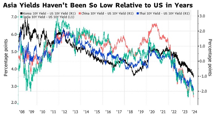 原本菲律宾等国家在年初有可能降息。但在美国居高不下的通胀促使交易员推迟对美联储放松政策时机的押注后,情况发生了变化。美联储不那么鸽派的前景意味着,美国相对于亚洲的收益率升幅可能会保持在高位,这可能促使全球资金撤出该地区,并压低当地货币汇率。因此,印度将出现一年多来首次出现债务资金流出,而泰国和印尼也出现固定收益资金净流出。
