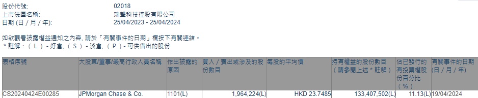 智通财经APP获悉,香港联交所最新资料显示,4月19日,摩根大通增持瑞声科技(02018)196.4224万股,每股作价23.7485港元,总金额约4664.74万港元。增持后最新持股数目约1.33亿股,最新持股比例为11.13%。