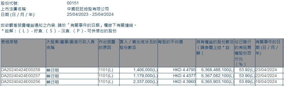 智通财经APP获悉,香港联交所最新资料显示,4月19日-4月23日,中国旺旺董事长蔡衍明连续三个交易日增持中国旺旺(00151),分别为233.7万股、117.9万股以及140.6万股,每股作价分别为4.3960港元、4.4377港元、4.4795港元,总金额约为2180.37万港元。增持后最新持股数目约为63.68亿股,最新持股比例为53.92%。