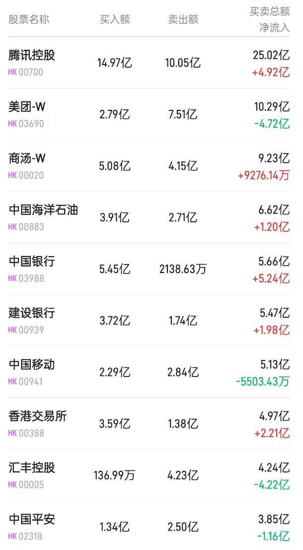 北水净买入最多的个股是中国银行(03988)、港交所(00388)、腾讯(00700)。北水净卖出最多的个股是汇丰控股(00005)、中国移动(00941)。