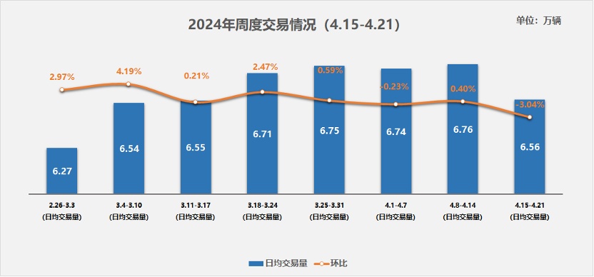 智通财经APP获悉,中国汽车流通协会发文称,2024年4月第三周,二手车日均交易量6.56万辆,与上周环比下降3%,清明小长假前后的交易需求基本转化完毕,本周交易量有所回落。按可比口径计算,2024年4月1日-21日,二手车共交易114万辆,由于4月前三周的有效工作日少于上月,因此交易量较3月同期下降1.7%。预计4月二手车的交易规模在168万辆,较去年同期增长7.2%。