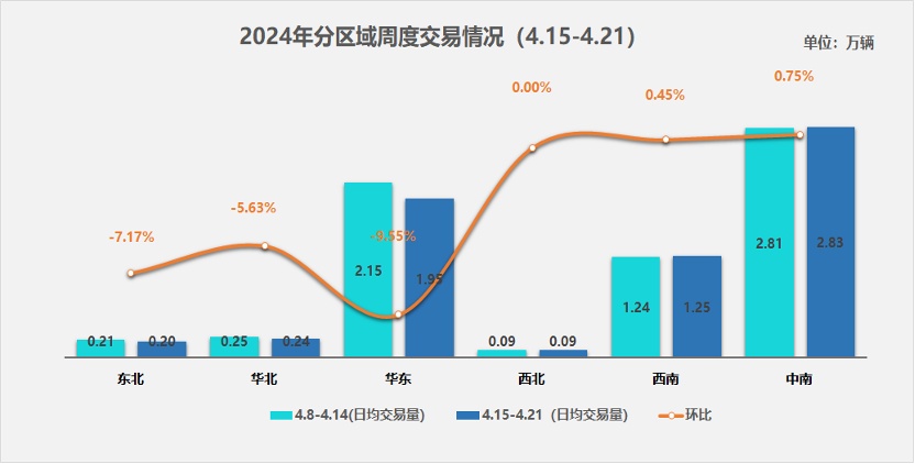 具体来看,华东地区作为二手车交易的重点区域,本周的日均交易量达到1.95万辆,但环比却下降了9.55%,显示出市场的一定波动。尽管整体表现相对平稳,但内部省份间的差异却颇为显著。福建、江西、上海和浙江等省份均实现了环比正增长,江苏和山东的环比降幅却较为明显,尤其是山东,降幅超过了17%,因此,需要针对不同地区的实际情况制定更为精细化的市场策略。