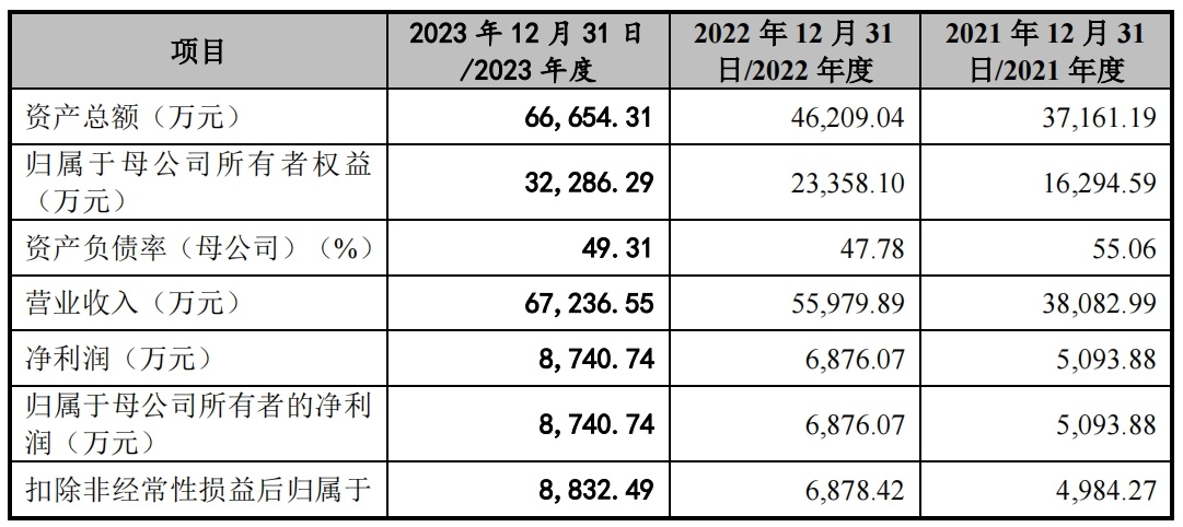 财务方面,于2021年、2022年、2023年,公司实现营业收入分别约为3.81亿元、5.60亿元、6.72亿元;同期,公司实现净利润分别为5093.88万元、6876.07万元、8740.74万元。