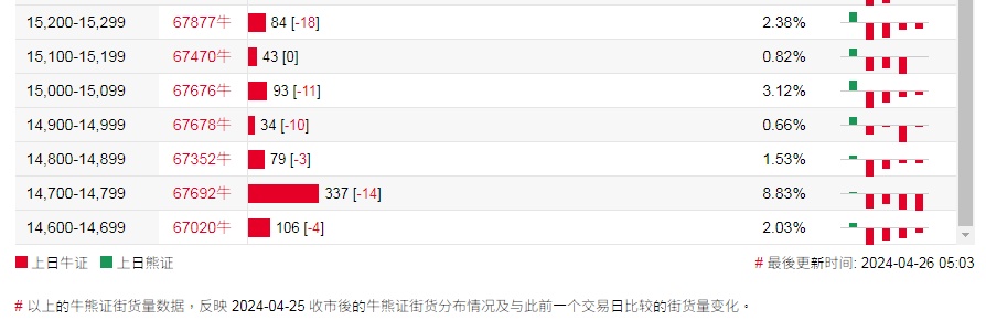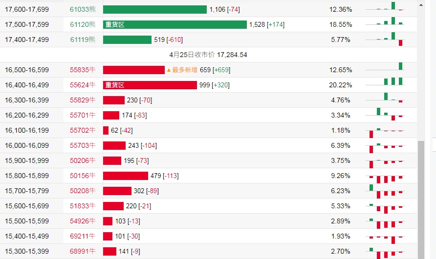 牛证街货重货区在16400-16499区间,该区间最新牛证数量为999张,较上一交易日增加320张;最多新增在16500-16599区间,该区间最新牛证数量为659张,较上一交易日增加659张。