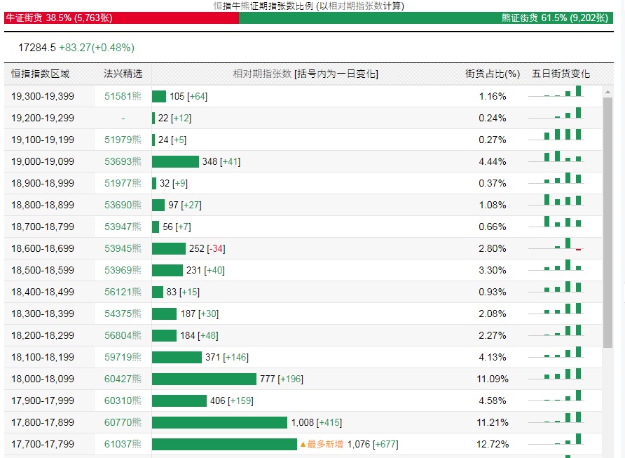 法兴恒指牛熊证街货分布图中的数据显示,熊证街货重货区在17500-17599区间,该区间最新熊证数量为1528张,较上一交易日增加174张;最多新增在17700-17799区间,该区间最新熊证数量为1076张,较上一交易日增加677张。