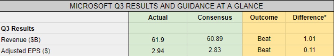 智通财经获悉,微软(MSFT.US)公布了截至3月31日的第三财季业绩。受企业客户对云计算和人工智能产品需求的提振,微软第三财季销售额和利润增幅超过预期。Q3营收增长17%至619亿美元,每股盈利为2.94美元;分析师平均预期营收609亿美元、每股盈利2.83美元。该公司股价在尾盘交易中大幅上涨。