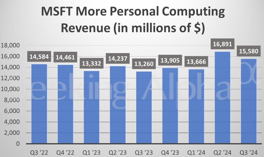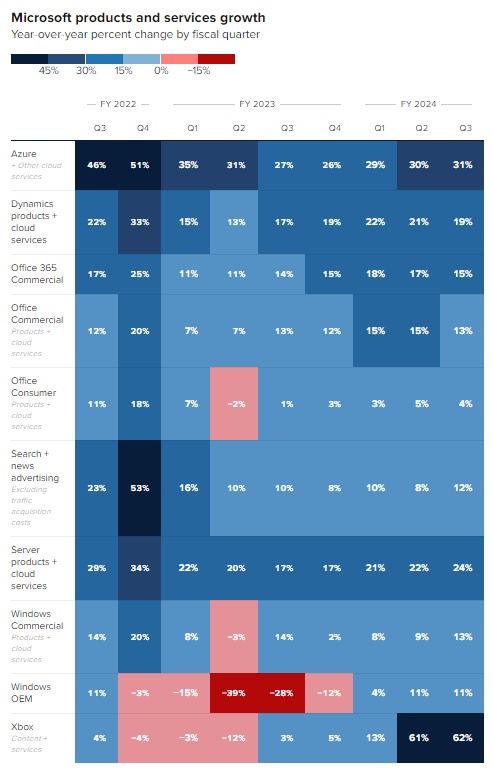 而个人电脑业务的营收增长主要得益于面向PC制造商的Windows OEM销售增长11%,Xbox内容和服务销售增长62%,其中61%归因于微软收购动视暴雪的净影响。