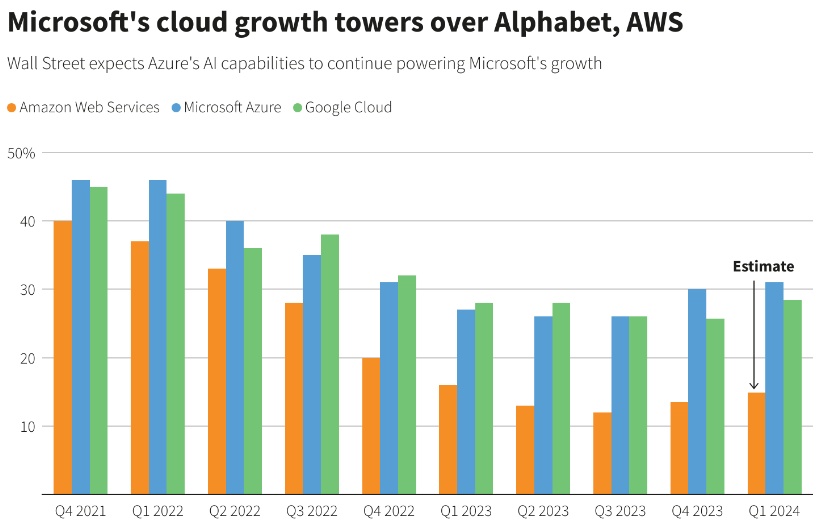 今年以来,微软的股价上涨了10%以上,落后于谷歌母公司Alphabet(GOOGL.US)和亚马逊(AMZN.US)等竞争对手,后者分别上涨了15%和22%。过去12个月,微软的股价上涨了32%,亚马逊上涨了67%,谷歌上涨了47%。这三家公司正在竞争,看谁能为企业客户和客户提供最全面的人工智能解决方案,无论是对OpenAI和Anthropic等第三方公司进行大量投资,还是像谷歌那样重组内部团队。