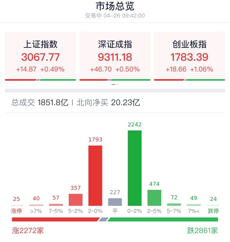 4月26日,A股早盘震荡走强,创业板指拉升涨逾1%。盘面上,券商、贵金属、算力、飞行汽车等方向涨幅居前,环保、地产、教育等板块跌幅居前。