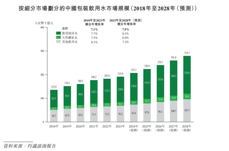 根据灼识咨询报告,按零售额计,2023年中国包装饮用水市场规模为人民币 2,150亿元,2018年至2023年的复合年增长率为7.1%,预计到2028年将达到人民币 3,143亿元,2023年至2028年的复合年增长率为7.9%。