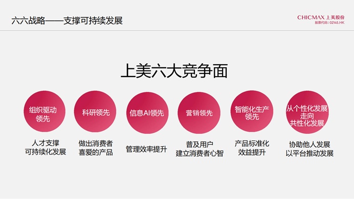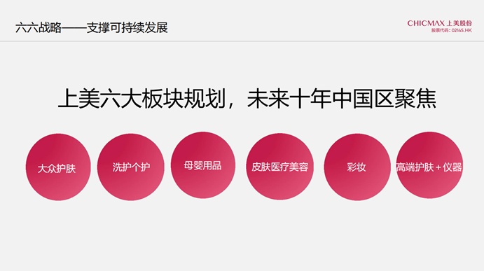 在此次发布的2023年报中,上美股份也明确了支撑可持续发展的“六六战略”——通过组织驱动领先、科研领先、信息AI领先、营销领先、智能化生产领先、从个性化发展到共性化发展构筑六大大竞争面,并将在未来十年内聚焦中国区,从大众护肤、洗护个护、母婴用品、皮肤医疗美容、彩妆、高端护肤+仪器六大板块布局业务发展。