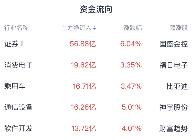 主力资金方面,资金青睐证券、消费电子、乘用车等行业,净流入证券行业近57亿元;资金出逃国有大型银行、城商行、化学制药、电力等行业。