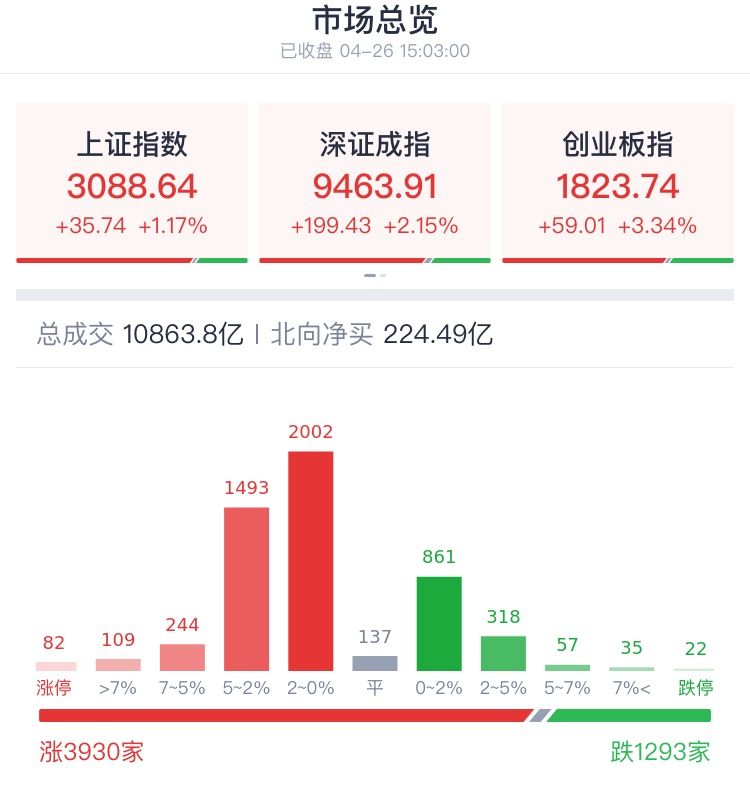 4月26日,A股放量大涨,沪指剑指3100点,创指大涨超3%!万亿成交再现,外资罕见爆买逾220亿,创陆港通开通以来新高。盘面上,券商等大金融股掀涨停潮,AI概念股全线爆发,量子科技、贵金属等板块涨幅居前;银行、港口航运、煤炭、小家电等板块跌幅居前。