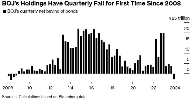 日本政府债券的投资者已经尝到了日本央行量化紧缩的滋味。根据对日本央行数据的分析,随着赎回膨胀,日本央行第一季度的净购买量降至负2.79万亿日元(合179亿美元)。