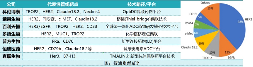 另据据西南证券研报,国内共有170多个ADC药物在研,其中进入临床阶段的近60个。横向对比国内ADC企业不难发现,国内的ADC在研靶点较为分散,集中度最高的HER2靶点的研发数占比为38%。此前国金证券公布的一份研报也显示,国内ADC在研药物有超过60个是靶向HER2,位居首位。