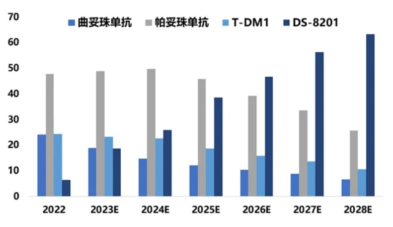 在目前全球HER2乳腺癌市场,DS-8201统治力不容小觑。市场预测,随着DS-8201后续持续放量、涨势迅猛,其预计将于2026年销量超过其余的HER2乳腺癌治疗药物并可能在2028年突破60亿美元。目前该药已在国内上市,在DS-8201挤压下,维迪西妥单抗后续拓展前线治疗市场的难度或进一步提高。