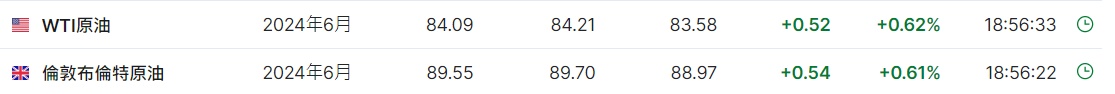 3. 截至发稿,WTI原油涨0.62%,报84.09美元/桶。布伦特原油涨0.61%,报89.55美元/桶。