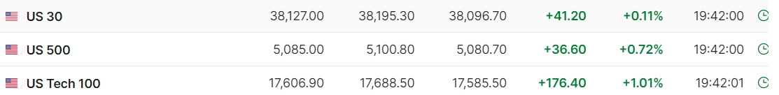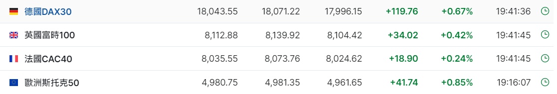 2. 截至发稿,德国DAX指数涨0.67%,英国富时100指数涨0.42%,法国CAC40指数涨0.24%,欧洲斯托克50指数涨0.85%。