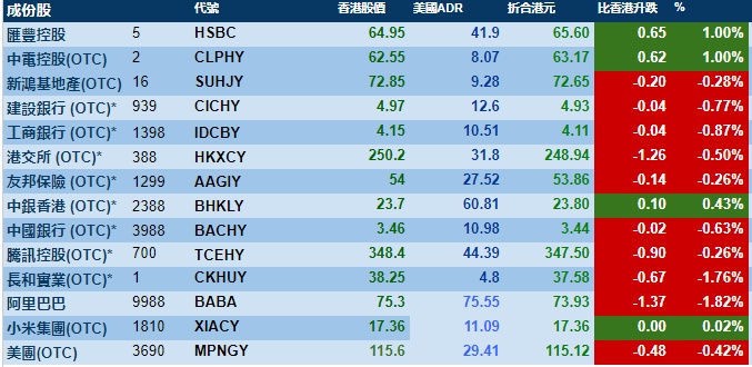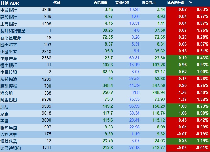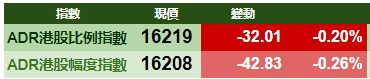 智通财经APP获悉,周五美股三大指数齐涨,港股ADR指数微跌,按比例计算,收报16219点,较香港收市跌32.01点或0.20%。