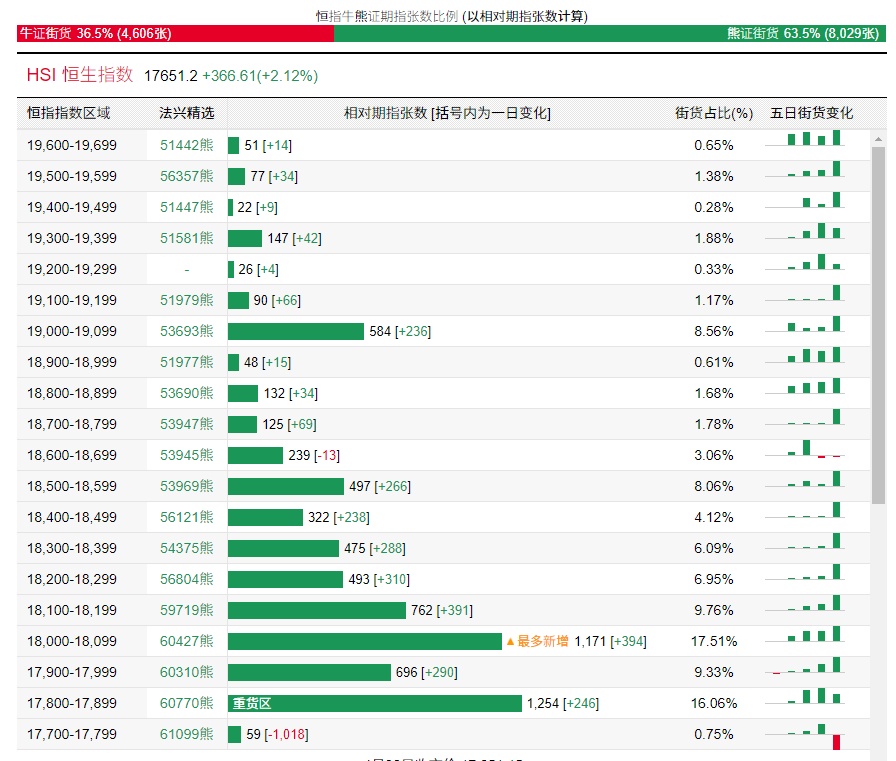 法兴恒指牛熊证街货分布图中的数据显示,熊证街货重货区在17,800-17,899区间,该区间最新熊证数量为1,254张,较上一交易日增加246张;最多新增在18,000-18,099区间,该区间最新熊证数量为1,171张,较上一交易日增加394张。