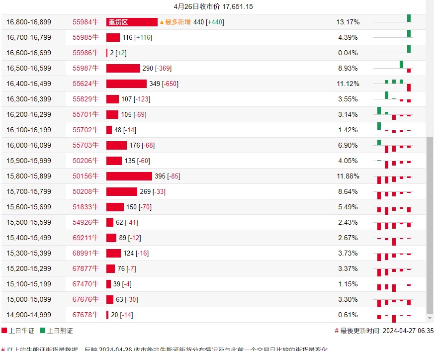 牛证街货重货区在16,800-16,899区间,该区间最新牛证数量为440张,较上一交易日增加440张;最多新增在相同区间。