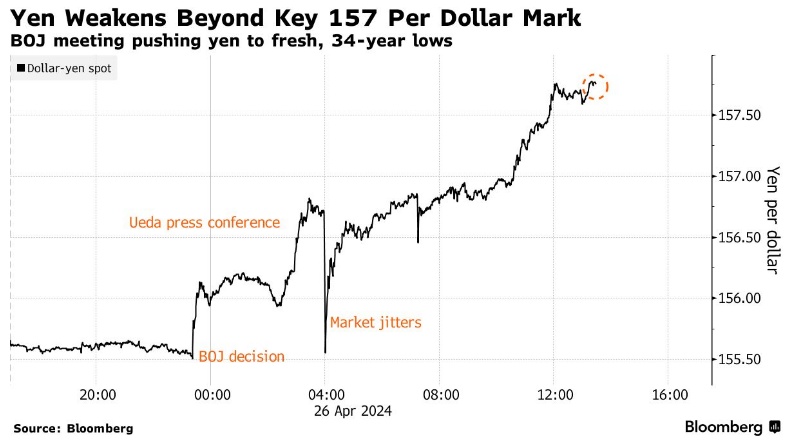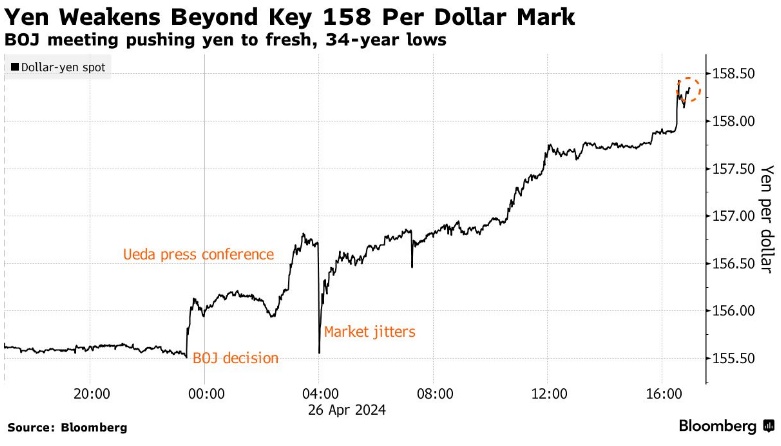 当日,日元兑美元汇率下跌了1.8%,触及158.33美元的盘中低点,在纽约尾盘交易中跌势加剧。当日早些时候,日元便开始下跌,此前日本央行在政策会议上称将维持关键利率不变,行长植田和男在新闻发布会上也几乎未发表支持日元的言论。